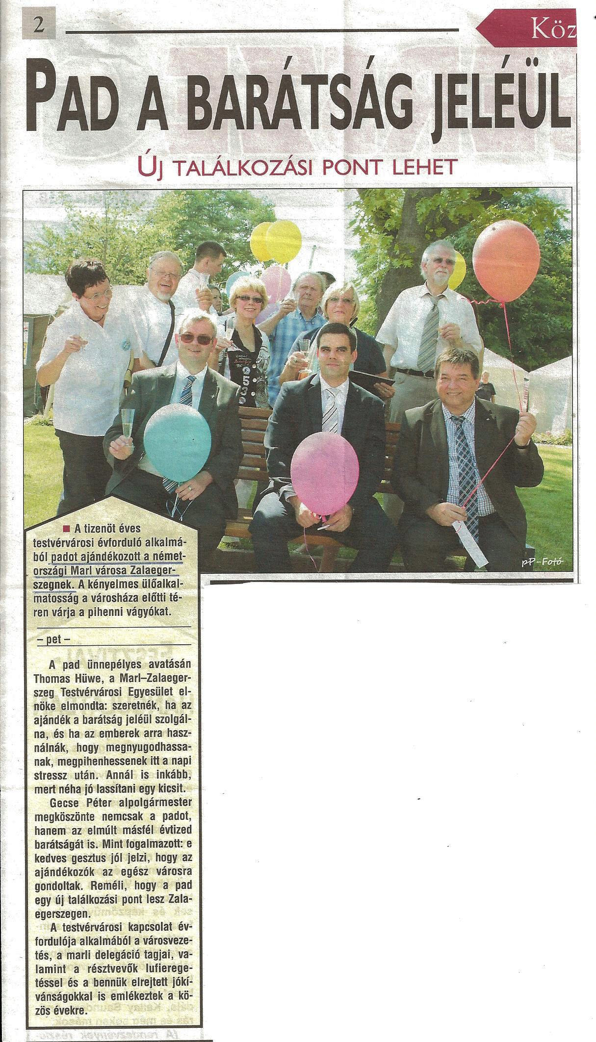 Zum 15-jährigen Jubiläum der Städtepartnerschaft schenkte der Städtepartnerschaftsverein Marl-Zalaegerszeg aus Deutschland eine Sitzbank an Zalaegerszeg. Die bequeme Sitzgelegenheit auf dem Platz vor dem Rathaus wartet auf die Erholungsuchenden.