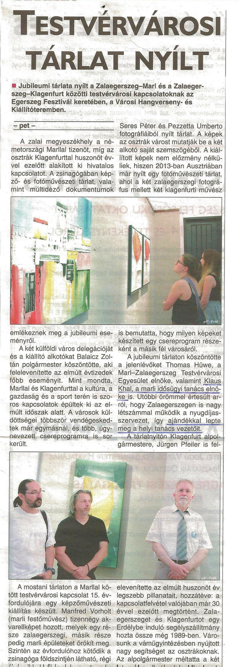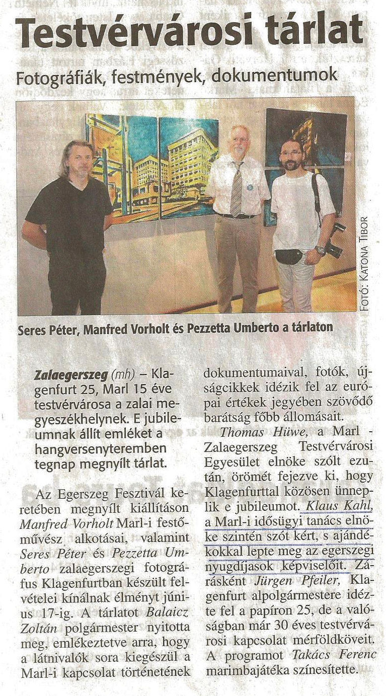 In der im Rahmen des Egerszeg Festivals eröffneten Ausstellung bieten die Werke des Malers aus Marl, Manfred Vorholt, sowie die Aufnahmen über Klagenfurt von Seres Péter und Pezzetta Umberto, beide Fotografen aus Zalaegerszeg, bis zum 17. Juni ein Erlebnis. Die Ausstellung wurde von Balaicz Zoltán, dem Bürgermeister der Stadt eröffnet, mit dem Hinweis darauf, dass die Reihe der Kunstwerke mit den geschichtsträchtigen Dokumenten der Beziehungen zu Marl ergänzt wird; durch Fotos, Zeitungsartikel wird an die wichtigsten Stationen der im Zeichen der europäischen Werte entstandenen Freundschaft erinnert.
